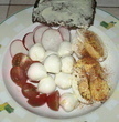 150 g mozarelly  | 2 vejce  |  ředkvičky  |  rajčata  | lžička grilovacího koření  |  tmavé pečivo  |  máslo na pečivo